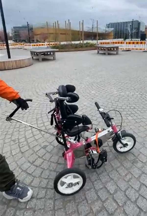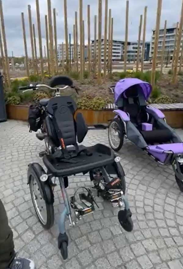 Yhdistelmäpyörän pyörätuoliosan saa irrotettua, mikä mahdollistaa myös esimerkiksi kauppareissut pyöräilyn ohessa.