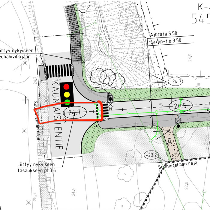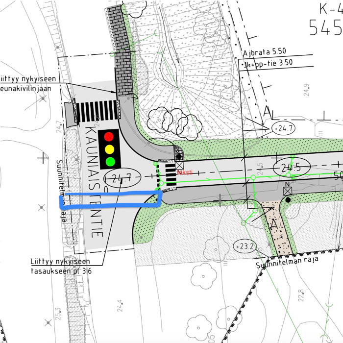 Bensowinkujan ja Kauniaistentien risteyksessä tulee huomioida se, että pyöräily tapahtuu kaksisuuntaisena Bensowinkujan ajoradalla. Tästä johtuen Kauniaistentien pohjoislaidalle tulee toteuttaa yhteys Bensowinkujan kanssa suorassa linjassa nykyisen pensasalueen läpi Kauniaistentien pyörätielle ja toteuttaa sille myös pohjoisen suunnasta ylitettäessä liikennevalo-ohjaus käyttäen pyöräilijöille tarkoitettuja liikennevaloja (kuva 1). Esimerkiksi Helsingissä tämänkaltaiset ratkaisut ajoradalta risteävän tien pyörätielle ovat arkipäivää nykyisissä suunnitelmissa ja niitä käytetään myös liikenteellisesti erittäin vilkkaissa risteyksissä, kuten esimerkiksi Mechelininkadun ja Lapinlahdentien risteyksessä.